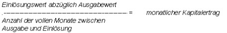 Einlösungswert abzüglich Ausgabewert dividiert durch die Anzahl der vollen Monate zwischen Ausgabe und Einlösung = monatlicher Kapitalertrag."