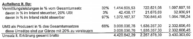 Um dem Umstand Rechnung zu tragen, dass die "A-Verträge" als Vermittlungsleistungen zu berücksichtigen sind, wurde von der BP eine schätzungsweise Aufteilung der Umsätze, entsprechend den Zahlen der Gewinn- und Verlustrechnung (Verhältnis der Treuhanderlöse zu den Gesamterlösen), vorgenommen, dies entspricht einem Anteil von rd. 31%. Wie oben dargestellt, ist eine exakte Ermittlung dieser Aufteilung mangels einer (ordnungsmäßigen) Buchführung nicht möglich gewesen.