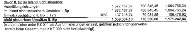 Die bisher unter Kennzahl 011 (= unechte Befreiungen) erfassten Förderungen und die Ausländersteuerrefundierung stellen keinen Umsatz dar, und gehören in der Umsatzsteuererklärung nicht erfasst. Es handelt sich dabei nicht um unechte Befreiungen im Sinne des Umsatzsteuergesetzes. Diese Beträge werden daher von der BP nicht berücksichtigt, und der angegebene Umsatz lt. Erklärung wurde von der BP bereits um diese Beträge gekürzt.