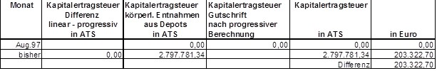 Der Einwand, dass das Aufkommen an Kapitalertragsteuer für den Fiskus ohnehin immer gleich sei, egal ob die Kapitalertragsteuer linear oder progressiv berechnet wird, übersieht, dass, wenngleich das Endergebnis gleich ist, während der Laufzeit Phasen auftreten, wo es krasse Unterschiede zwischen der linearen und progressiven Ermittlung gibt, die im Verhältnis zum inneren Wert zu ungerechtfertigt hohen Gutschriften aber auch Abzügen führen.