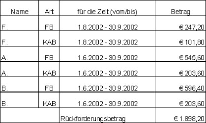Der Bw. leistete im Rückforderungszeitraum 1. Juni bis 30. September 2002 Unterhaltszahlungen in folgender Höhe: