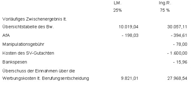 Betreffend die strittigen Sachverständigenkosten anerkennt die Amtspartei in der mündlichen Berufungsverhandlung die sofortige Abzugsfähigkeit dieser Kosten. Auch der UFS gelangt zu dieser Ansicht. Diese Aufwendungen in Höhe von € 1.600,00 stellen bei den Einkünften aus Vermietung und Verpachtung Werbungskosten im Sinne des § 16 EStG 1988 dar, da sie grundsätzlich der Ermittlung der fiktiven Anschaffungskosten und in weiterer Folge der Einkunftsermittlung dienen (vgl. Doralt, EStG-Kommentar, § 16, Tz 220).
