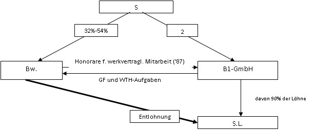 Die zwischen der Bw. und der B1-GmbH (bis 31. August 1987) bzw. M-GmbH (ab 1. September 1987) aufgrund eines Werkvertrages bestehenden Leistungsbeziehungen betreffend die Personalgestellung des S.L. und die gesellschaftsrechtlichen Verflechtungen stellen sich demnach graphisch wie folgt dar: