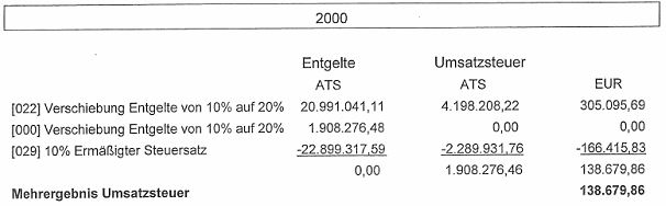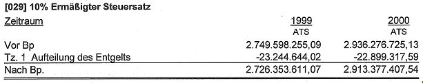 Infolgedessen wurden seitens der Betriebsprüfung die von MP Vertrieb KG dem 20 %igen und dem ermäßigten 10 % igen Steuersatz unterzogenen Entgelte in den Jahren 1999 und 2000 (per 30.6.2000 wurde der Betrieb auf die M. ZZ. GmbH & Co KG im Wege de Realteilung gem. Art V UmgrStG übertragen) wie folgt verschoben