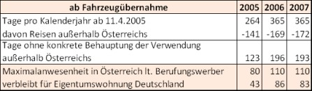 Seit Übernahme des strittigen Fahrzeuges (11. April 2005) befand sich der Berufungswerber in den Jahren 2005 bis 2007 zwischen 141 und 172 Tagen pro Kalenderjahr auf Reisen im Ausland. Er selbst gibt an, er habe versucht nachzuweisen, dass er im Jahr - mit Unterbrechungen - nicht mehr als 110 Tage in Österreich anwesend ist (Schreiben vom 30. März 2008 Pkt. 4). Tatsächlich legte er allerdings nur Nachweise über weniger "Auslandsaufenthaltstage" vor. Nachweise bzw. konkrete Behauptungen zu den Aufenthalten in seiner Wohnung in Adr.D fehlen - trotz Aufforderung - zur Gänze.