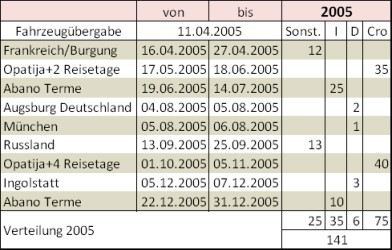 "... Für mich ist in diesem Zusammenhang allein entscheidend, wo sich das in Frage stehende Auto während der letzten drei Jahre überwiegend befunden hat, d. h. in Österreich oder nicht. Aus diesem Grund versuche ich anhand von Belegen, die ich z.T. eher zufällig aufbewahrt und sehr mühsam und zeitaufwendig zusammengesucht habe, aufzuzeigen, wie lange seit 2005 bis Ende 2007 das Auto nachweislich nicht in Österreich war. Die Betonung liegt auf nachweislich, weil ich einiges nicht mit Nachweisen belegen kann. Einige Hotelrechnungen, besonders bezüglich kürzerer Recherche-Fahrten, für die Jahre 2005 bis 2007-habe ich in der Annahme, sie nicht mehr zu benötigen, leichtsinnigerweise erst vor kurzer Zeit entsorgt, weshalb ich z.T. ausschließlich auf andere Belege angewiesen bin, die ich meiner Krankenkasse in Deutschland habe einreichen müssen. In ganz wenigen Fällen verlasse ich mich auf Logik (Hin- bzw. Rückfahrt nach bzw. von Opatija/Abano Terme) und Gedächtnis. Flugreisen trete ich in aller Regel von München aus an, so dass sich das Auto auch während der Reisen dieser Art selbstverständlich in Deutschland befindet.