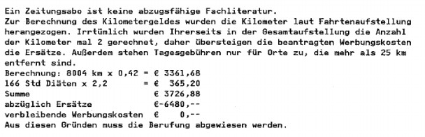 Die Berufung wurde als unbegründet abgewiesen. Für die geltend gemachten Kilometergelder wurde kein ordnungsmäßiges Fahrtenbuch vorgelegt, die Kilometer wurden nur anhand einer Aufstellung rechnerisch ermittelt.