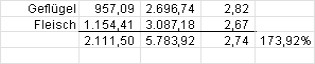 Putenschnitzel | 24,90 | 6,90 | 171,81 | 188,99 | 5,00 | 4,40 | 547,80 | 189,86% | 2,90 |