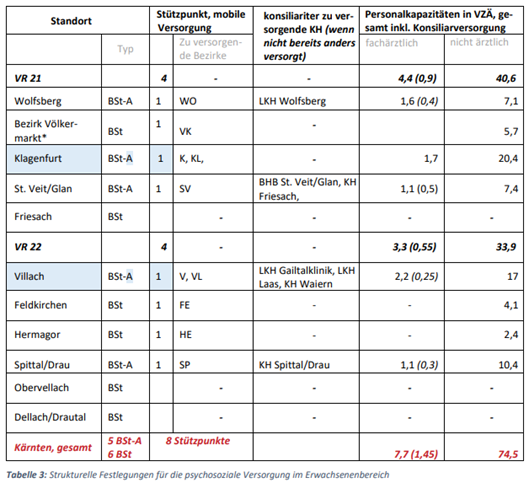 Soweit die Planung der psychosozialen Versorgung nach §1 Abs1 Z3 iVm Anlage 1 Punkt 9 der Verordnung betroffen ist, ist im Hinblick auf die verbindlichen (jeweils blau hinterlegten) Teile aus dem Regionalen Strukturplan Gesundheit – Kärnten 2025 nicht ersichtlich, dass darin bundesgesetzliche Vorschriften durchgeführt werden, die ihre Grundlage in Art10 B‑VG hätten (siehe bereits oben in Abschnitt II.2.). Vielmehr haben die strukturellen Vorgaben unter den Punkten 9.1 und 9.2 der Anlage 1 jeweils die Standorte und die Zahl der Ambulatorien iSv §2 Z5 und §13 K-KAO zur Versorgung von Erwachsenen bzw von Kindern und Jugendlichen zum Gegenstand, während sich die Regelung zur Durchführung von Hausbesuchen durch die Ambulatorien auf §2 Z5 letzter Satz und §13 Abs7 K-KAO stützt (vgl auch die Grundsatzbestimmungen des §2 Abs1 Z5 letzter Satz und §3a Abs7 KAKuG).