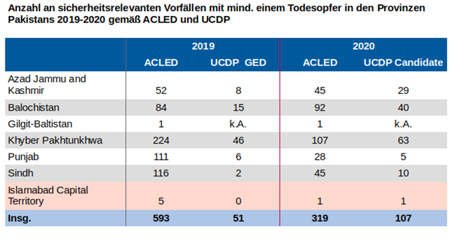 Quelle: ACLED o.D.; UCDP Candidate o.D.; UCDP GED o.D.Farbig hervorgehoben: Hauptstadtregion. UCDP weist sicherheitsrelevante Vorfälle in den ehem. FATA eigens aus, hier wurden sie zur besseren Vergleichbarkeit der Provinz Khyber Pakhtunkhwa hinzugezählt.
