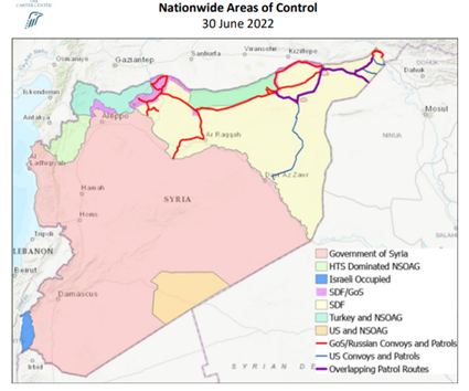 Die folgende Karte zeigt Kontroll- und Einflussgebiete unterschiedlicher Akteure in Syrien mit Stand 5.8.2022