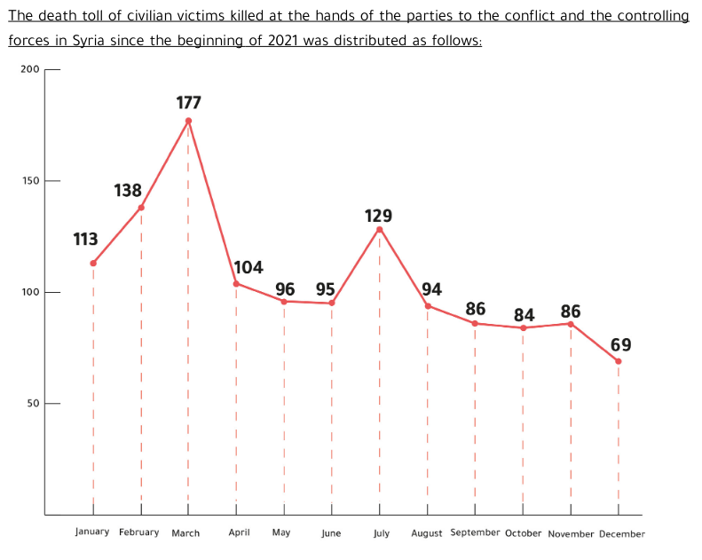 Die NGO Syrian Network for Human Rights (SNHR) versucht die Zahlen ziviler Todesopfer zu erfassen. Getötete Kämpfer werden in dem Bericht nicht berücksichtigt, außer in der Zahl der aufgrund von Folter getöteten Personen, welche sowohl Zivilisten als auch Kämpfer berücksichtigt. Betont wird außerdem, dass die Organisation in vielen Fällen Vorkommnisse nicht dokumentieren konnte, besonders im Fall von "Massakern", bei denen Städte und Dörfer komplett abgeriegelt wurden. Die hohe Zahl solcher Berichte lässt darauf schließen, dass die eigentlichen Zahlen ziviler Opfer weit höher als die unten angegebenen sind. Zudem sind die Möglichkeiten zur Dokumentation von zivilen Opfern auch von der jeweiligen Konfliktpartei, die ein Gebiet kontrolliert, abhängig (SNHR 1.1.2020; vgl. SNHR 1.1.2021).