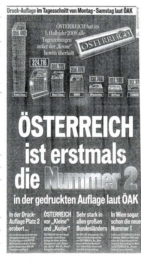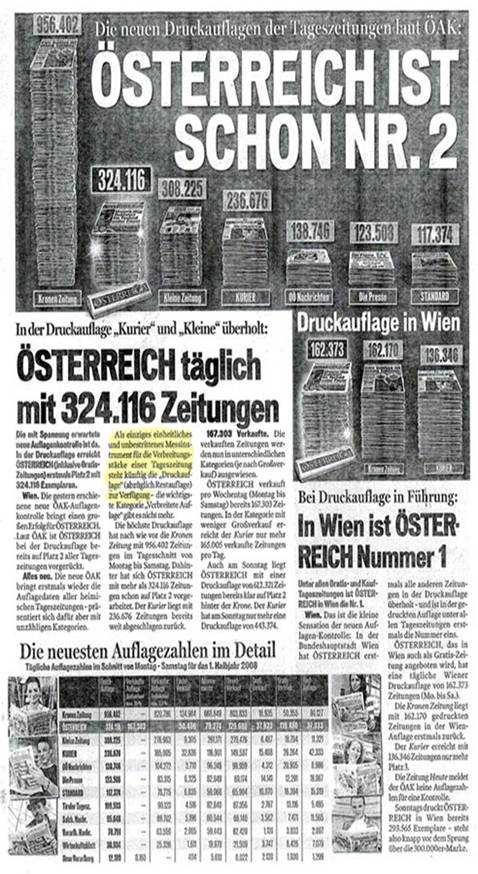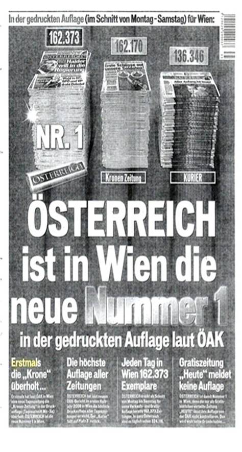 Gestützt auf die Zahlen der ÖAK erschienen im August 2008 sowie im Jänner und Februar 2009 in der Zeitung der Erstbeklagten die im Anhang zu dieser Entscheidung abgedruckten Werbemitteilungen; die Zweitbeklagte hielt diese Inhalte auf ihrer Website zum Abruf bereit. Darin wurden die Druckauflagen (unter anderem) der Zeitungen der Klägerin und der Erstbeklagten miteinander verglichen. Aufgrund eines Vorsprungs von etwa 200 Stück behaupteten die Beklagten, die Zeitung der Erstbeklagten sei in Wien die „Nummer 1“. Österreichweit sei diese Zeitung die „Nummer 2“. Beide Aussagen waren blickfangartig hervorgehoben und mit einem Hinweis auf die Druckauflagen verbunden.