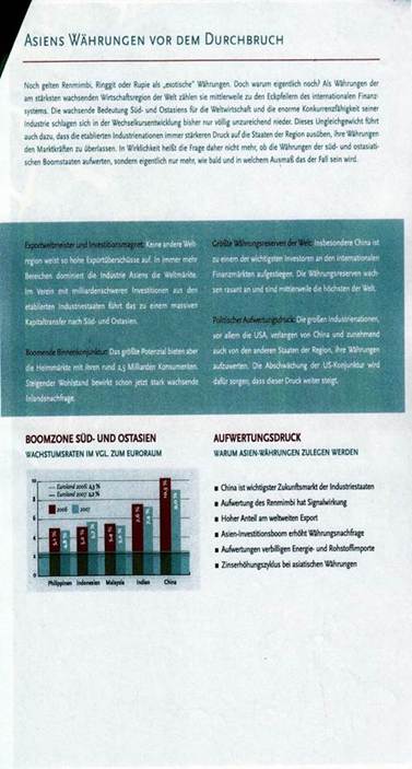 Die den Klägern von der Beraterin übergebene Werbebroschüre (vier Seiten im Format A4) beschreibt unter der Überschrift „Asiens Währungen vor dem Durchbruch“ die Kursentwicklung der für das beworbene Zertifikat maßgeblichen asiatischen Währungen und verweist auf die wachsende Bedeutung Süd- und Ostasiens für die Weltwirtschaft, die hohen Exportüberschüsse, die boomende Binnenkonjunktur, die großen Währungsreserven (insbesondere Chinas) sowie den politischen Aufwertungsdruck. Die Wachstumsraten der betreffenden Länder sind ‑ im Vergleich zum Euro-Raum ‑ grafisch dargestellt und Gründe aufgezählt, warum mit einer Aufwertung der im Währungskorb vertretenen Währungen zu rechnen sei. Unter der Überschrift „enormes Potential und 100%ige Sicherheit“ wird erläutert, dass der Anleger während der Laufzeit des Papiers im Ausmaß von 200 % an der Aufwertung des Währungskorbs teilnimmt, dass die Rückzahlung des gesamten eingesetzten Kapitals garantiert wird („100 Prozent Kapitalgarantie“), dass die Laufzeit vier Jahre beträgt und das Produkt „in Partnerschaft mit Lehman Brothers, einem der weltweit führenden Anbieter für strukturierte Währungsprodukte mit spezieller Expertise für den asiatischen Raum begeben“ wird. Die Kapitalgarantie wird dahin näher erläutert, dass es trotz des hohen Ertragspotentials für den Anleger kein Verlustrisiko gebe, weil eine Garantie für das gesamte eingesetzte Kapital vorhanden sei. Auch wenn der Währungskorb abgewertet werden sollte, erhalte der Anleger den vollen Kapitaleinsatz zurück. Unter der Zwischenüberschrift „Große Chancen, kein Risiko“ werden die Vorteile des Produkts unter Hinweis auf 13,38 % pa historische Rendite auf Basis einer Rückrechnung für alle vier Jahresperioden von 1992 bis 2006 mit den Schlagworten: „Basket der attraktivsten asiatischen Währungen, 100% Kapitalgarantie, hohe Performancepartizipation, kurze Laufzeit und Referenzwährung EUR“ zusammengefasst. Daneben wird unter der Überschrift „Eckdaten“ die Emittentin Lehman Brothers Treasury Co. BV genannt und auf deren Rating A1/A+/A+ (dies entspricht offenbar den Bewertungen der führenden Rating-Agenturen Moody's, S&P und Fitch, vgl Baum aaO FN 1) verwiesen. Die Wertpapierart wird mit „Zertifikat mit Kapitalgarantie“ beschrieben, die vierjährige Laufzeit beginnend ab 5. 12. 2006 datumsmäßig angeführt sowie Emissionskurs (100 % zuzüglich 5 % Agio), Basiswert (näher beschriebener asiatischer Währungskorb), Partizipation (200 %), Stückelung (1.000 EUR) und die Orte der Börsennotiz (Luxemburg und Frankfurt) ausgewiesen. Die Werbebroschüre enthält keinen Hinweis auf die Person der Garantin (eine andere Gesellschaft der Lehmann-Gruppe).
