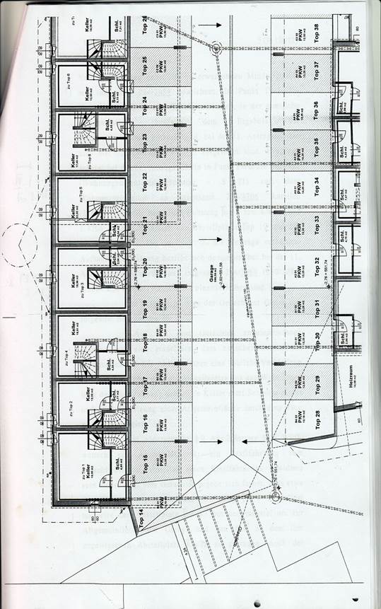Die zum Verband der jeweiligen Wohnungen gehörigen, im Kellergeschoß gelegenen Räume weisen über eine ebenfalls im Keller befindliche Schleuse eine Türe auf, durch die die unmittelbar vorgelagerten Kfz-Abstellplätze erreicht werden können. Diese Kfz-Abstellplätze sollen nach der derzeitigen Zuordnung im Wohnungseigentumsvertrag im Wohnungseigentum des Wohnungseigentümers der jeweils dahinter liegenden Wohnung stehen.