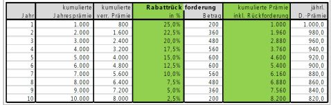 Mit Rücksicht auf die vereinbarte Vertragslaufzeit wird ein Dauerrabatt in Höhe von 20 % der Normalprämie (dies entspricht 25 % der vorgeschriebenen Prämie) gewährt. Bei vorzeitiger Vertragsbeendigung vor Ablauf von 10 Jahren kann der Versicherer die Differenz zwischen dem gewährten Dauerrabatt und dem für die tatsächliche Laufzeit zu gewährenden Dauerrabatt nachfordern. Die Nachforderung berechnet sich wie folgt: