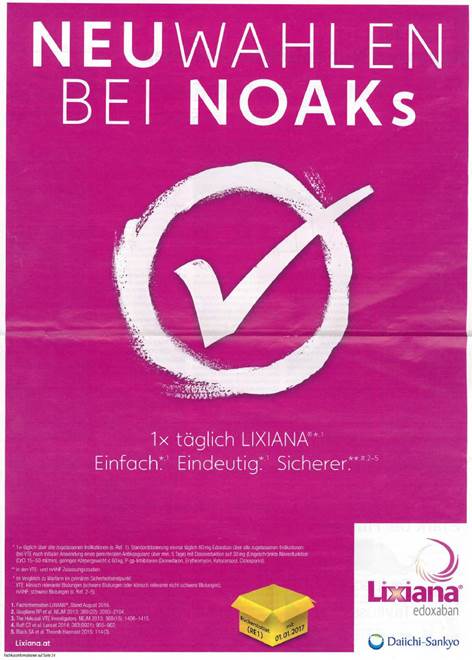 Schließlich sei LIXIANA auch nicht – wie in der Werbung hervorgehoben werde – „sicherer“. Für einen direkten Anwendungsvergleich zu anderen NOAKs fehle es an entsprechenden Studien. Sämtliche Sicherheits- und Risikoparameter seien in den Zulassungsstudien zu LIXIANA nur im Vergleich zum Wirkstoff Warfarin (einem Vitamin‑K‑Antagonisten und keinem NOAK) getestet worden, was in der Werbung auch durch einen entsprechenden Hinweis angemerkt sei. Durch diesen – erst bei genauerer Betrachtung ersichtlichen – Hinweis werde jedoch etwas völlig anderes referenziert (nämlich ein Vergleich zu Warfarin), als blickfangartig suggeriert werde (nämlich ein Vergleich zu anderen NOAKs).