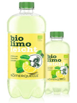 [2] Das Getränk befindet sich in einer transparenten Plastikflasche, in der die hellgelb-grünliche Flüssigkeit zu sehen ist. Auf dem Frontetikett sind das Logo eines trinkenden Römers, eine Limette, vier Minzblätter und eine aufgeschnittene Zitrone sowie die Schriftzüge „bio limo leicht“ und „zitrone limette minze“ erkennbar: