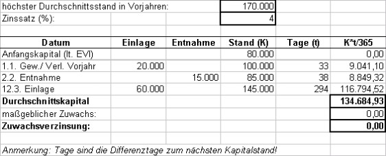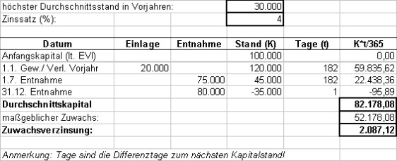 Als Eigenkapitalzuwachs sind der den Durchschnittsstand aus Vorjahren übersteigende Anfangsstand des Kapitalkontos und der Jahreszuwachs zu werten. Dass die Entnahme am Ende des Wirtschaftsjahres zu einem negativen Kapitalkontenstand führt, hat auf Grund der kurzen Dauer des Negativstandes praktisch keine Auswirkung auf den Jahresdurchschnittsstand, führt aber dazu, dass für die Folgejahre das höhere Durchschnittskapital dieses Jahres (82.178,08) als Bezugsgröße für den Kapitalzuwachs heranzuziehen ist.