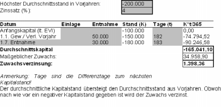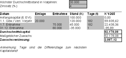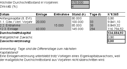 Als Eigenkapitalzuwachs sind der den Durchschnittsstand aus Vorjahren übersteigende Anfangsstand des Kapitalkontos und der Jahreszuwachs zu werten. Dass die Entnahme am Ende des Wirtschaftsjahres zu einem negativen Kapitalkontenstand führt, hat auf Grund der kurzen Dauer des Negativstandes praktisch keine Auswirkung auf den Jahresdurchschnittsstand, führt aber dazu, dass für die Folgejahre das höhere Durchschnittskapital dieses Jahres (82.178,08) als Bezugsgröße für den Kapitalzuwachs heranzuziehen ist.