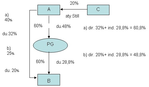 a) Die beteiligte Körperschaft A ist einerseits 60% Mitunternehmer einer Personengesellschaft, die ihrerseits 60% der Anteile einer Körperschaft B hält, und andererseits zivilrechtlich unmittelbar mit 40%, auf Grund einer atypisch stillen Beteiligung des C am Handelsgewerbe der Körperschaft A (C : A = 20% : 80%) aber nur mittelbar mit 32% an der Körperschaft B beteiligt. Insgesamt liegt eine mehr als 50%ige Beteiligung (60,8%) an der Körperschaft B vor (die 60,8% ergeben sich aus 32%, das sind 80% von 40% + 28,8%; das sind 60% von 48%).