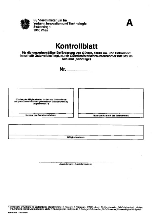 Am 18. Juli 2007 ist die Verordnung des Bundesministers für Verkehr, Innovation und Technologie über die während der Kabotage mitzuführenden Kontrollblätter (Kabotagekontrollverordnung - KKV), BGBl. II Nr. 132/2007, in Kraft getreten. Durch diese Verordnung werden die gemeinsam mit der Gemeinschaftslizenz während der Kabotage mitzuführenden Kontrollblätter festgelegt. Diese Kontrollblätter (siehe nachstehendes Muster) werden vom Bundesministerium für Verkehr, Innovation und Technologie an Transportunternehmen aus EU/EWR-Staaten (mit Ausnahme von Bulgarien, Estland, Lettland, Litauen, Polen, Rumänien, der Slowakei, Tschechien und Ungarn, für die ein generelles Kabotageverbot gilt) ausgegeben, sind - entsprechend ausgefüllt - vom Lenker mitzuführen und den Kontrollorganen im Falle einer Kontrolle vorzulegen.