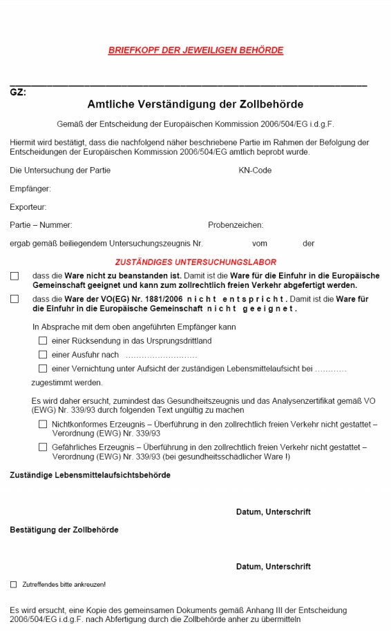 Im Falle einer zu beanstandenden Sendung teilt die Lebensmittelaufsichtsbehörde dem betroffenen Unternehmer die Tatsache mit und klärt mit diesem die weitere Vorgangsweise ab. Der Unternehmer hat gemäß Artikel 21 (1) b) die zuständige Behörde des Ursprungsdrittlandes zu informieren. Parallel dazu wird die zuständige Zollbehörde über die zu beanstandende Ware vorinformiert. Im Falle einer beabsichtigten Rücksendung der Ware übermittelt die Lebensmittelaufsichtsbehörde erst dann die "amtliche Verständigung der Zollbehörde" an die zuständige Zollbehörde, wenn der Unternehmer der Lebensmittelaufsicht belegt, dass er gemäß Artikel 21 (1) b) der Verordnung (EG) Nr. 882/2004 die zuständige Behörde des Ursprungsdrittlandes über die Gründe und Umstände, die dem Inverkehrbringen der betreffenden Lebensmittel in der Gemeinschaft entgegenstanden, unterrichtet hat. Die Zollbehörde gibt die Ware erst dann frei, wenn sie die "amtliche Verständigung der Zollbehörde" von der zuständigen Lebensmittelaufsichtsbehörde übermittelt bekommt. Das Formular "amtliche Verständigung der Zollbehörde" wurde im Sinne einer leichteren Kommunikation zwischen den betroffenen Behörden neu gestaltet (laut beiliegendem Muster). Diejenige Behörde (Lebensmittelaufsicht oder Zoll), die den leichteren Zugang zu den Originaldokumenten hat, macht diese gemäß Verordnung (EWG) Nr. 339/93 Artikel 6 Absatz 1 oder 2 ungültig. Die jeweils zutreffenden Formulierungen sind auf dem Formular bereits vorgegeben. Der Text "Gefährliches Erzeugnis - Überführung in den zollrechtlich freien Verkehr nicht gestattet - Verordnung (EWG) Nr. 339/93" ist nur dann anzukreuzen, wenn im Gutachten des Untersuchungslabors die Ware als gesundheitsschädlich oder ungeeignet für den menschlichen Verzehr beurteilt wird.
