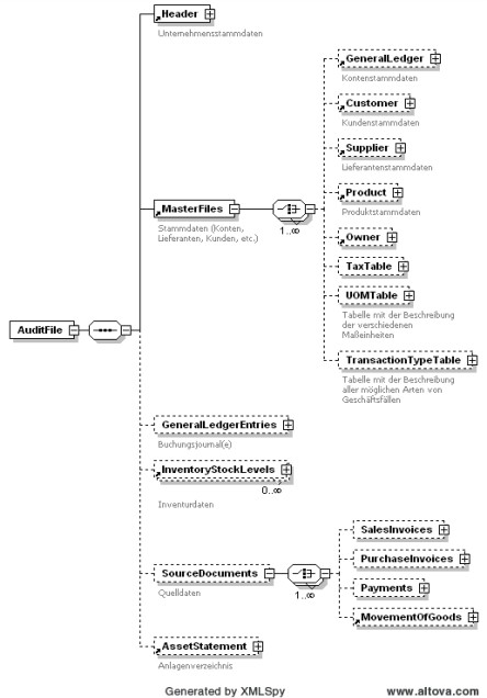 Der Inhalt des Standard Audit File - Tax ist in der entsprechenden Schema-Datei (XSD-Datei) genau definiert. Der grundsätzliche Aufbau enthält folgende Daten: