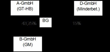 An der GmbH-D besteht eine Gruppenmitglieder-Beteiligungsgemeinschaft aus der mit 40% hauptbeteiligten GmbH-B und der mit 20% minderbeteiligten GmbH-C. Wird die GmbH-B auf die GmbH-D down-stream verschmolzen, kommen zwei Möglichkeiten in Betracht: