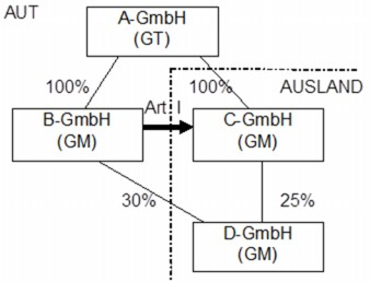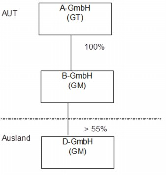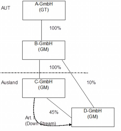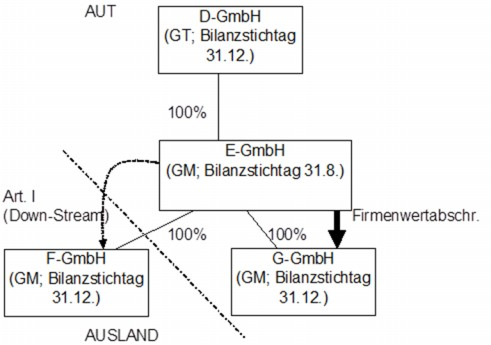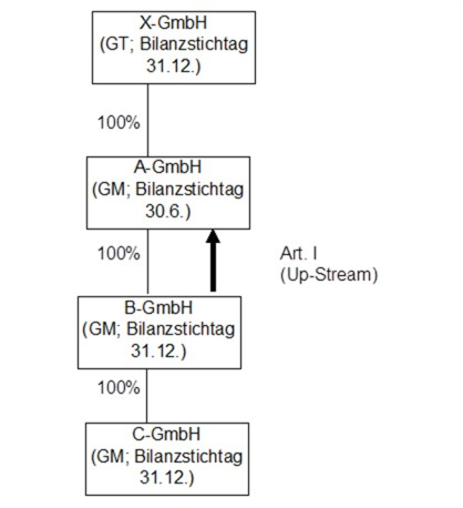 Die Unternehmensgruppe besteht aus der A-GmbH (Gruppenträger) sowie der inländischen B-GmbH, an der die A-GmbH zu 100% beteiligt ist, sowie aus den ausländischen Gruppenmitgliedern C-GmbH, an der die B-GmbH mit 100% beteiligt ist, und D-GmbH, an der die B-GmbH mit 10% und die C-GmbH mit 45% beteiligt sind. Zum 31.12.07 wird die C-GmbH auf die D-GmbH down stream verschmolzen.