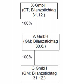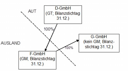 Die D-GmbH (Wj=Kj) ist Gruppenträger, die 100% der Anteile am inländischen Gruppenmitglied E-GmbH (Wj=1.9.-31.8.) hält. Die Gruppe besteht seit dem Jahr 04. Die lediglich vermögensverwaltend tätige E-GmbH ihrerseits hält 100% der Anteile am inländischen Gruppenmitglied G-GmbH (Wj=Kj) sowie ebenfalls 100% am ausländischen (deutschen) Gruppenmitglied F-GmbH (Wj=Kj).