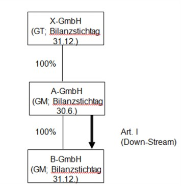 Der Gruppenträger GT ist zu 100% am Gruppenmitglied GM 1 beteiligt, GM 1 ist zu 100% an GM 2 beteiligt. Weiters ist der GT zu 100% am Gruppenmitglied GM 3 beteiligt. Sowohl auf die Beteiligung an GM 1 als auch GM 3 hat der GT eine Firmenwertabschreibung vorgenommen. Der Gruppenträger GT wird zum Stichtag 31.12.07 auf GM 2 verschmolzen. Die Beteiligung von GT an GM 1 geht verschmelzungsbedingt auf GM 2 über und wird zur Abfindung der Gesellschafter des Gruppenträgers verwendet. Zudem hält GM 2 nunmehr die Beteiligung an GM 3. Die Unternehmensgruppe bleibt bestehen, GM 1 wird Gruppenträger der nunmehr aus GM 2 und GM 3 bestehenden Unternehmensgruppe.