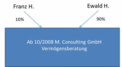 Bisheriger Geschäftsführer Franz H. verbleibt im Unternehmen (bisher alleinvertretungs-befugt, ab Übertragung Gesamtvertretung mit einem weiteren Geschäftsführer). Hinzutritt von Ewald H. (Bruder von Franz H.) als weiterer Geschäftsführer mit Alleinvertretungsbefugnis per 31.10.2008. Neuer Unternehmensgegenstand der nunmehr umfirmierten M. Consulting GmbH ist die Vermögensberatung (Ausübung durch Ewald H.).