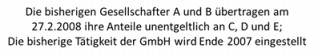 2) 27.02.2008 Abtretung der Anteile von A und B an C, D und E durch Schenkung und gleichzeitige Zession der Forderung des A gegenüber der GmbH an die neuen Gesellschafter