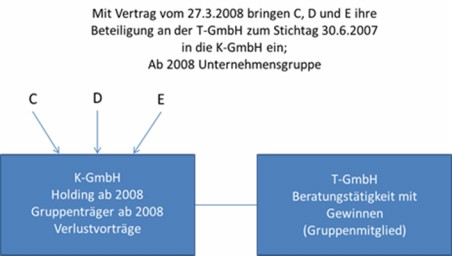 Mit Einbringungsvertrag vom 27.03.2008 bringen die Gesellschafter C, D u. E ihre Anteile an der T-GmbH zum 30.6.2007 in die K-GmbH ein. Damit ist die T-GmbH eine 100-prozentige Tochter der K-GmbH geworden (Gruppe ab 2008).
