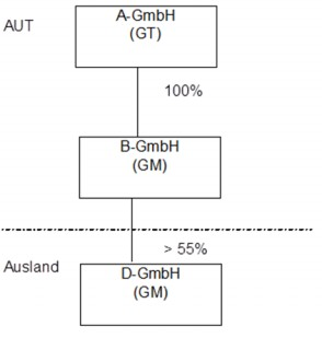 In diesem Fall kann eine inländische Tochtergesellschaft D eines ausländischen Gruppenmitglieds trotz ausreichender finanzieller Verbindung nicht in die Unternehmensgruppe einbezogen werden. (Bewertung der Beteiligung an der C und D gemäß § 16 Abs. 1 UmgrStG ; siehe Rz 857).