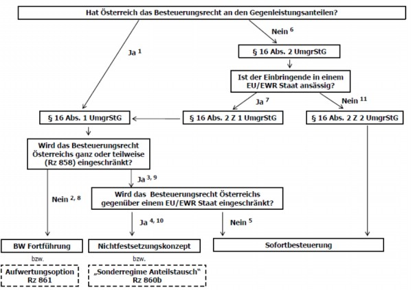 851 ff | Die Ausführungen betreffend die § 16 und § 17 UmgrStG werden grundlegend überarbeitet, übersichtlicher strukturiert und durch zahlreiche Beispiele erweitert. Insbesondere die Abgrenzung von § 16 Abs. 1 und § 16 Abs. 2 Z 1 und Z 2 UmgrStG, sowie die daran jeweils geknüpften Rechtsfolgen bei der Bewertung des eingebrachten Vermögens werden im Detail dargestellt, durch zahlreiche Beispiele ergänzt undüberblicksartig in Form eines "Entscheidungsbaumes" (siehe Rz 854a) veranschaulicht und erläutert. Mit dieser grundlegenden Überarbeitung des § 16 Abs. 1 und Abs. 2 UmgrStG in Zusammenhang stehend, wird auch die Bewertung von Kapitalanteilen nach Maßgabe des § 17 Abs. 1 und Abs. 2 UmgrStG in diesem Sinne angepasst. |