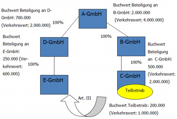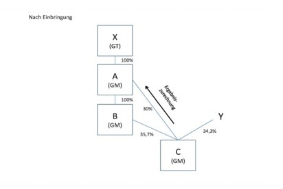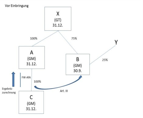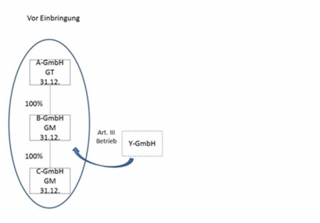 Die Unternehmensgruppe besteht aus der A-GmbH als Gruppenträger, der 100-prozentigen Tochter B-GmbH und der 100-prozentigen Tochter C-GmbH. Alle Gesellschaften bilanzieren auf den 31.12. Die unbeschränkt steuerpflichtige Y-GmbH bringt ihren Betrieb zum 31.12.02 in die B-GmbH gegen Gewährung neuer Anteile ein, sodass die Y-GmbH nach der Einbringung an der B-GmbH im Ausmaß von