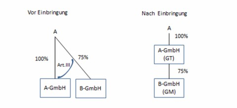 Einbringungsbedingt ist die Y-GmbH ab dem dem Einbringungsstichtag folgenden Tag (1.1.03) an der B-GmbH beteiligt.