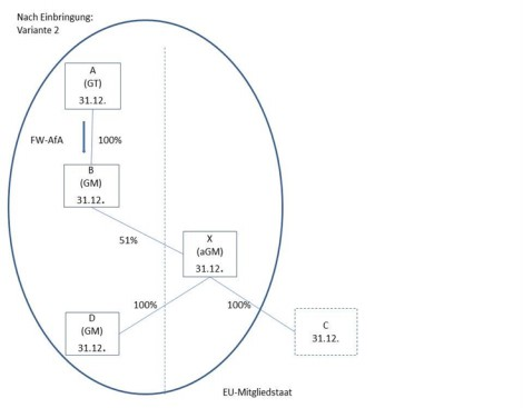 Entscheidet sie sich für eine Gruppenmitgliedschaft der nunmehrigen ausländischen Tochter X, welche grundsätzlich ab dem Jahr 03 möglich ist, so kann die Beteiligung an der C aufgrund des Ausschlusses der zweiten Beteiligungsebene im Ausland nicht mehr in die Gruppe einbezogen werden. Die C-GmbH scheidet daher jedenfalls durch die Einbringung aus der Unternehmensgruppe aus.