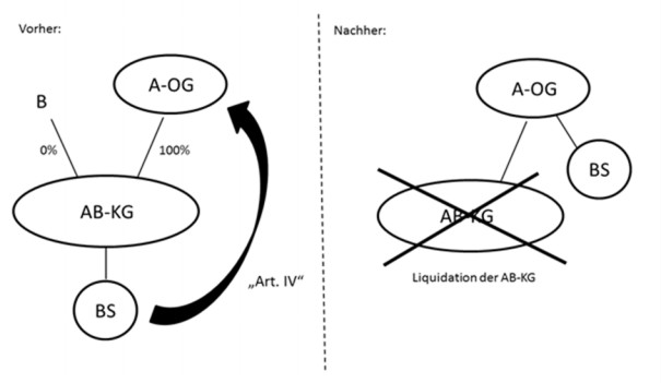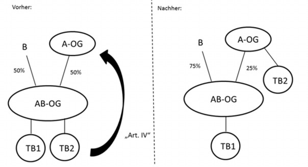Besteht in der Unternehmensgruppe eine Mitunternehmerschaft, über die weitere Gruppenmitglieder gehalten werden, ist ein Zusammenschluss durch Vermögensübertragung durch den Gruppenträgers oder ein Gruppenmitglied möglich, wodurch unter Umständen Beteiligungsverschiebungen ergeben können, ohne dass sich die Unternehmensgruppe ändert.