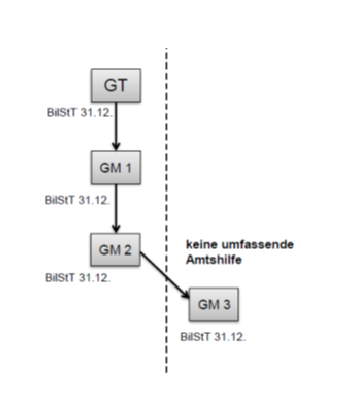 Da GM3 in einem Staat ansässig ist, mit dem keine umfassende Amtshilfe besteht, scheidet es zum 1.1.2015 aus der Unternehmensgruppe aus. GM3 kann jedoch bis 31.12.2014 unverändert Teil der Unternehmensgruppe bleiben, weshalb der bei GM3 im Wirtschaftsjahr 2014 ermittelte Verlust in Höhe von 100.000 letztmalig in das Gruppenergebnis eingehen kann. Das Ausscheiden von GM3 mit 1.1.2015 löst die Nachversteuerung sämtlicher noch nachversteuerungshängiger Verluste in Höhe von 900.000 aus. Im Jahr 2015 ist dem unmittelbar beteiligten Gruppenmitglied GM2 aber nicht der volle Nachversteuerungsbetrag, sondern bloß ein Drittel zuzurechnen. In den Veranlagungsjahren 2016 und 2017 folgt je ein weiteres Drittel. Da sowohl GM3, GM2 als auch GM1 als Bilanzstichtag den 31.12. haben, sind die "Nachversteuerungsdrittel" dem Gruppenträger ohne zeitliche Verzögerungen zuzurechnen; die effektive Nachversteuerung auf Ebene des Gruppenträgers erfolgt somit in Höhe von je 300.000 in den Veranlagungen für die Kalenderjahre 2015 bis 2017.
