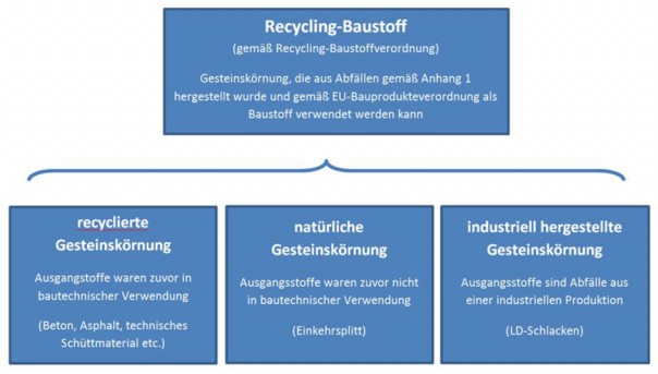 Die folgende Grafik illustriert den Zusammenhang der Begriffe Recycling-Baustoff (Überbegriff) sowie recyclierte, natürliche und industriell hergestellte Gesteinskörnungen gemäß dieser Verordnung: