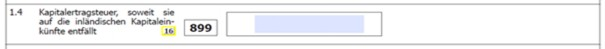 Erfolgte bereits ein KESt-Abzug durch eine inländische depotführende Stelle für den konkreten Fonds, ist die bereits für die erklärten Einkünfte abgeführte KESt des jeweiligen Kalenderjahres in der Kennzahl 899 anzugeben. Die KESt, die für inländische Dividenden, die dem Fonds zugeflossen sind, von der ausschüttenden Gesellschaft abgeführt worden sind, darf in dieser Kennzahl nicht eingetragen werden.