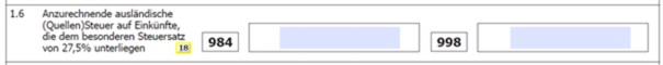 Zur Anrechnung ausländischer Quellensteuern, können die Kennzahlen 984 bzw. 998 ausgefüllt werden. Anrechenbare ausländische Quellensteuern können durch Addition der Punkte 8.1.1. bis 8.1.6. der Steuerdaten ermittelt werden.