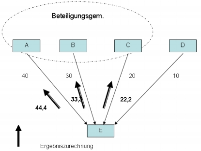 Die Kapitalgesellschaften A, B, C und D sind an der einzubeziehenden Zielkörperschaft E zu 40%, 30%, 20% und 10% beteiligt. A, B und C syndizieren sich, bilden eine Beteiligungsgemeinschaft und beziehen E in die Unternehmensgruppe ein (D kann mangels ausreichender Beteiligung an der Beteiligungsgemeinschaft nicht teilhaben). Das von E in weiterer Folge der Beteiligungsgemeinschaft zugerechnete Einkommen wird in der Beteiligungsgemeinschaft entsprechend der Beteiligungsverhältnisse von A, B und C aufgeteilt. Die Aufteilung bezieht sich auf eine Beteiligungssumme von 90%. A erhält daher rund 44,4%, B 33,3% und C 22,3% des Einkommens von E zugerechnet.