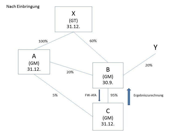 Am Gruppenmitglied C waren bis zur Einbringung das Gruppenmitglied B mit 51% und die gruppenfremde Gesellschaft Y mit 49% beteiligt. Auf Grund der Kapitalerhöhung erhält A eine Beteiligung von 30% an C, B ist nunmehr mit 35,7% an C beteiligt. Damit würde grundsätzlich die Gruppenzugehörigkeit von C enden. Allerdings ist A durch seine im Zuge der Einbringung erhaltene unmittelbare Beteiligung an C sowie durch seine mittelbare Beteiligung über das Gruppenmitglied B ausreichend finanziell mit C verbunden, sodass die Gruppenmitgliedschaft von C aufrecht erhalten werden kann.