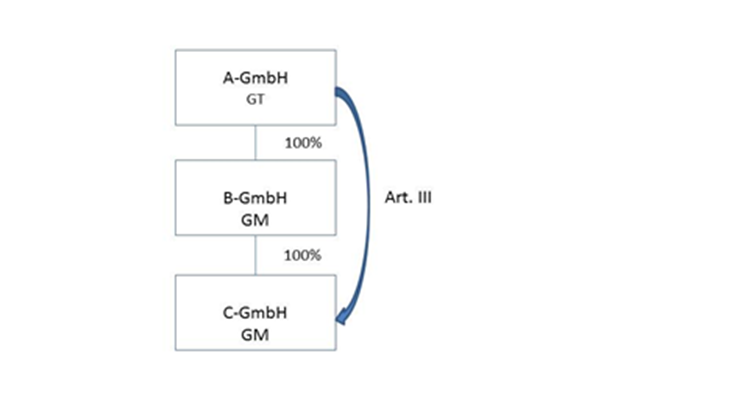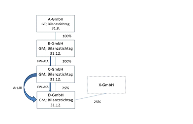 Der Gruppenträger X hält am Gruppenmitglied A 100% der Anteile. Das Gruppenmitglied A hält 100% der Anteile am Gruppenmitglied B, welches wiederum 51% der Anteile an Gruppenmitglied C hält. A bringt zum 31.12.01 begünstigtes Vermögen in das Gruppenmitglied C gegen Gewährung von Anteilen ein. Die Firmenbuchanmeldung erfolgt am 29.9.02.