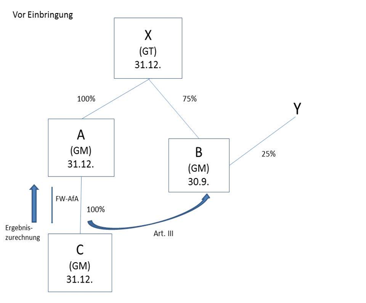 Die Einbringung erfolgt gegen Gewährung neuer Anteile gemäß § 19 Abs. 1 UmgrStG, wodurch sich die Beteiligung des Gruppenträgers X zum auf den Einbringungsstichtag folgenden Tag auf 60% vermindert und A in weiterer Folge ab diesem Stichtag zu 20% an B beteiligt ist.