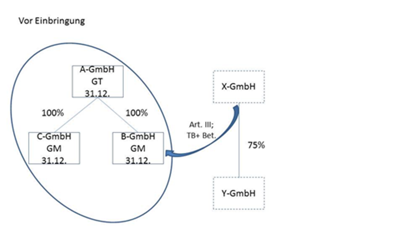 Die Unternehmensgruppe besteht aus der A-GmbH als Gruppenträger, der 100-prozentigen Tochter B-GmbH und der 100-prozentigen Tochter C-GmbH. Alle Gesellschaften bilanzieren auf den 31.12. Die unbeschränkt steuerpflichtige Y-GmbH bringt ihren Betrieb zum 31.12.02 in die B-GmbH gegen Gewährung neuer Anteile ein, sodass die Y-GmbH nach der Einbringung an der B-GmbH im Ausmaß von
